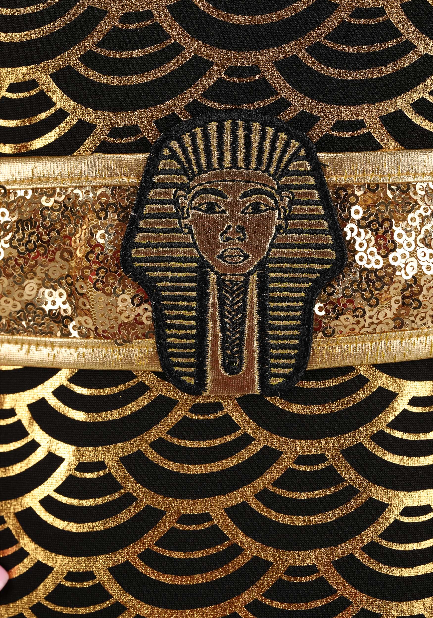 The gown is shaped from spandex to ensure it hugs and moves with your natural shape. Its all-over-print and attached shimmery mesh cape ensure the garment shines in any venue. A gold sequin belt, a headband with beads and a cobra charm, and a statement collar featuring a print of Bastet add the finishing touches to the costume.