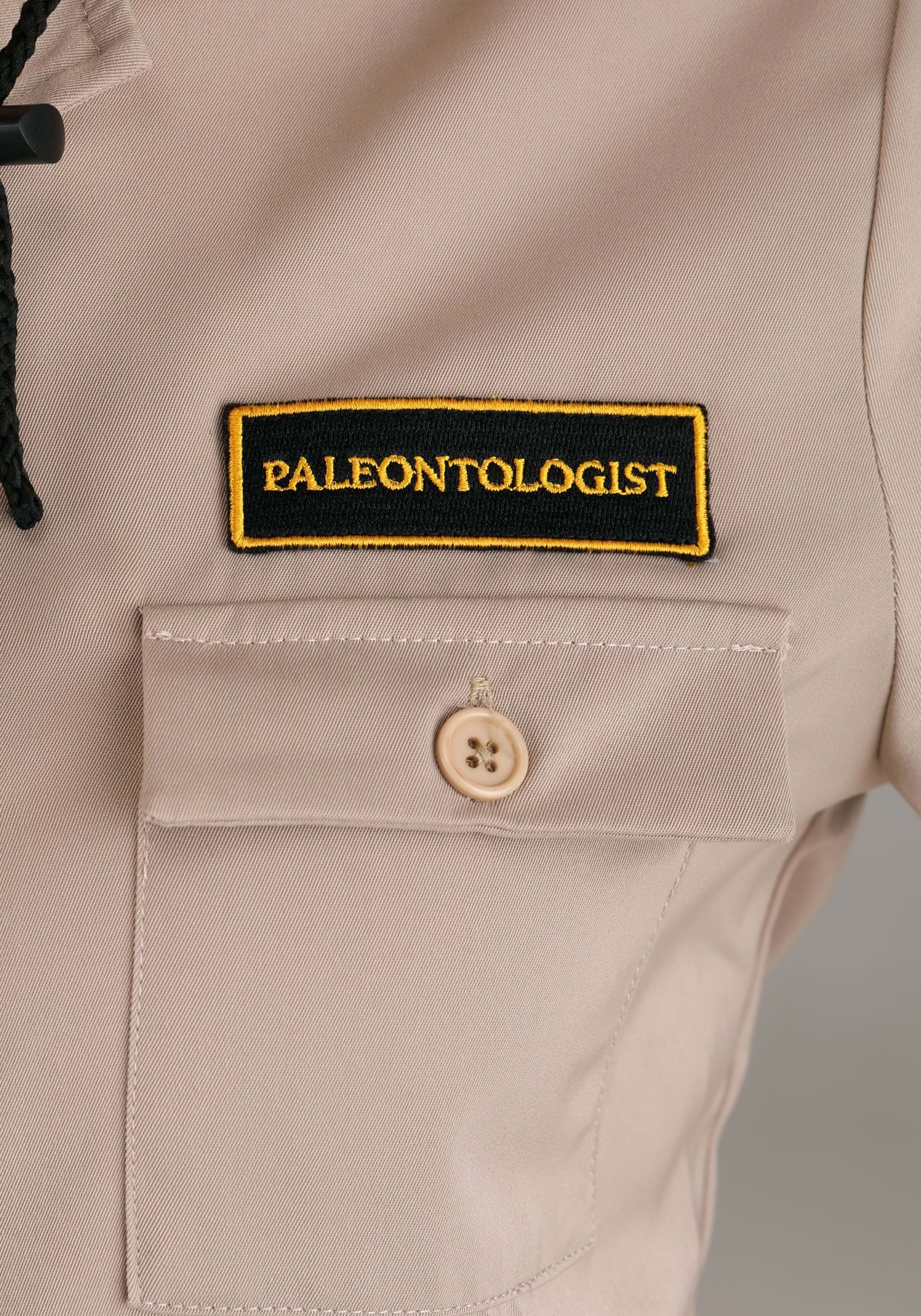 - Multiple patches of dinosaurs, bones, and the word PALEONTOLOGIST