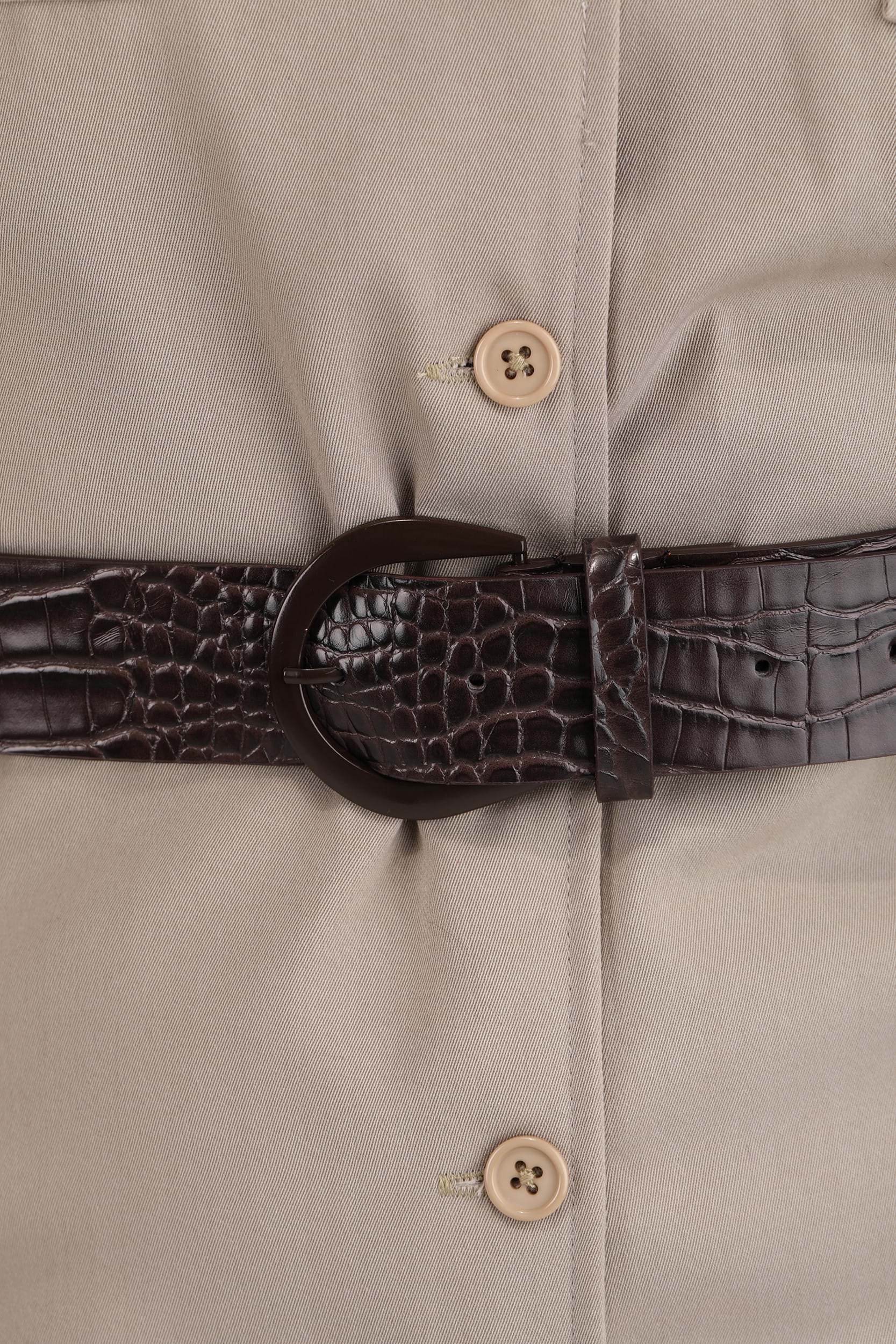 - Faux leather belt threads through loops at waistline of jumpsuit, fastens w/ metal buckle