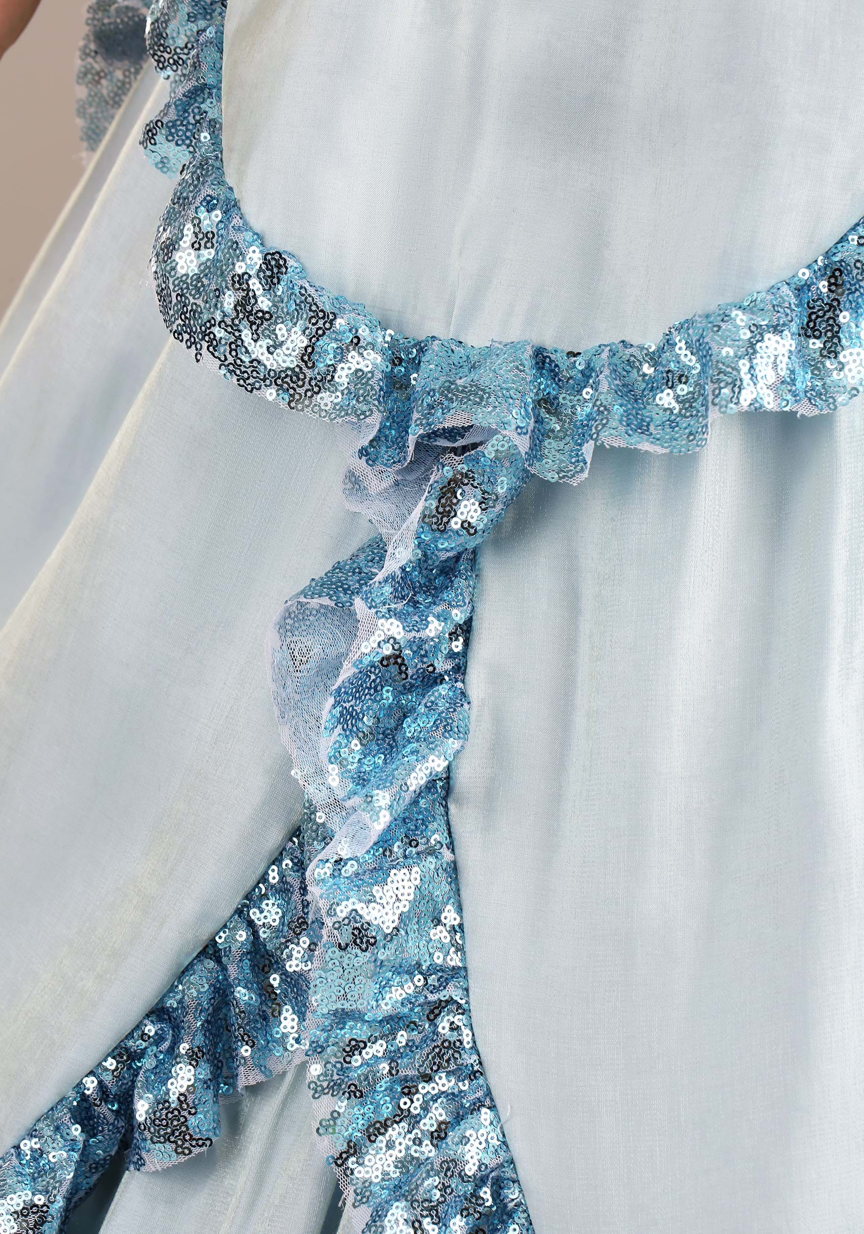 Designed with your stupendous Halloween entrance in mind, this costume comes straight from our in-house design studio, and stops at nothing to make you feel magically breathtaking! It's an ice-blue gown with an off-the-shoulder, sweetheart neckline, and dramatic draping panels on the skirt that are edged with stunning sequins. The same blue shine offsets the bodice. Pair this dress with gorgeous jewels, the tiara, and your wand and your popularity won't even come into question this holiday.