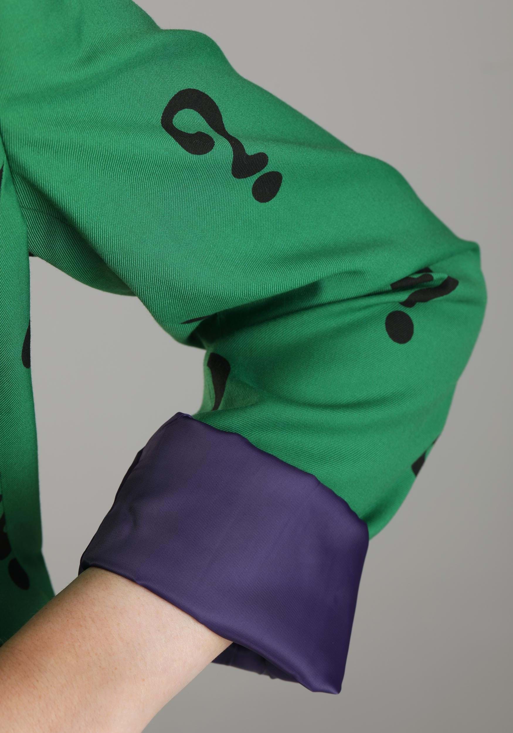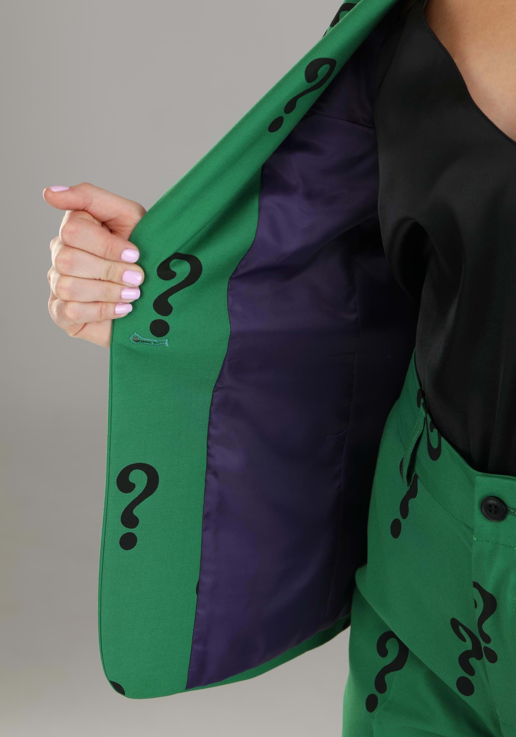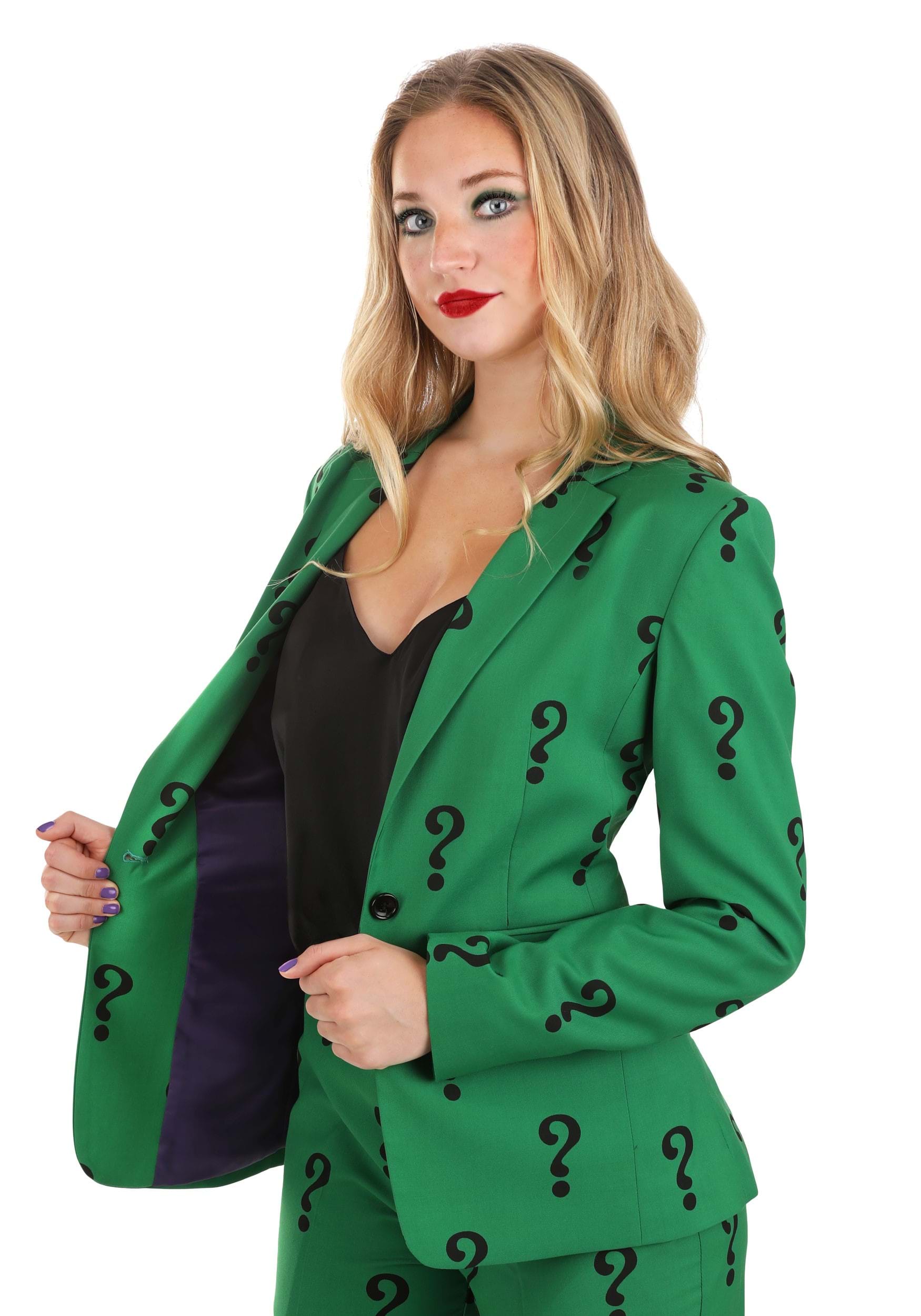 Well, now, Riddler, you can still rep your cause while looking suave and classy! This Women’s Riddler Blazer is the perfect mashup of sophistication and obfuscation. You will love the purple lining that sets off the bright green suit, just like your normal costume! The question mark covered blazer fits like a dream, complete with all the hallmarks of your dastardly trade. This Made By Us blazer has the highest quality and the best materials to make you look your best. We will provide the style, you just have to bring that characteristic wit and some rambling riddles!
