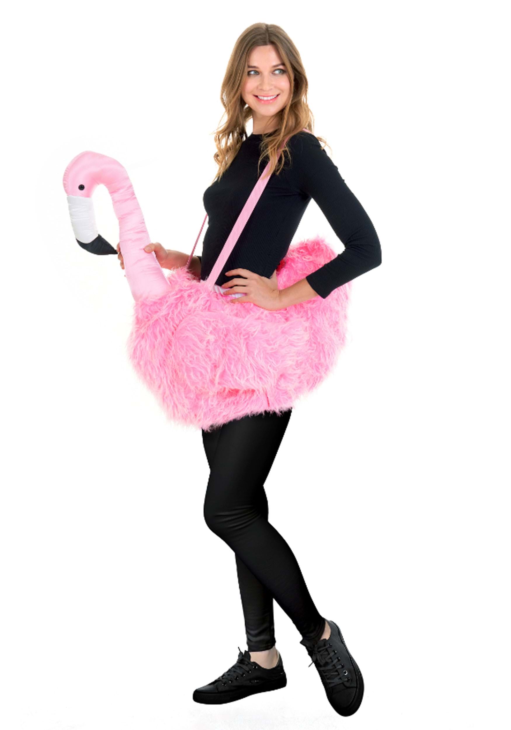 - Stuffed satin flamingo neck & head has a clear plastic loop that can go around wearer's neck to hold flamingo neck upright