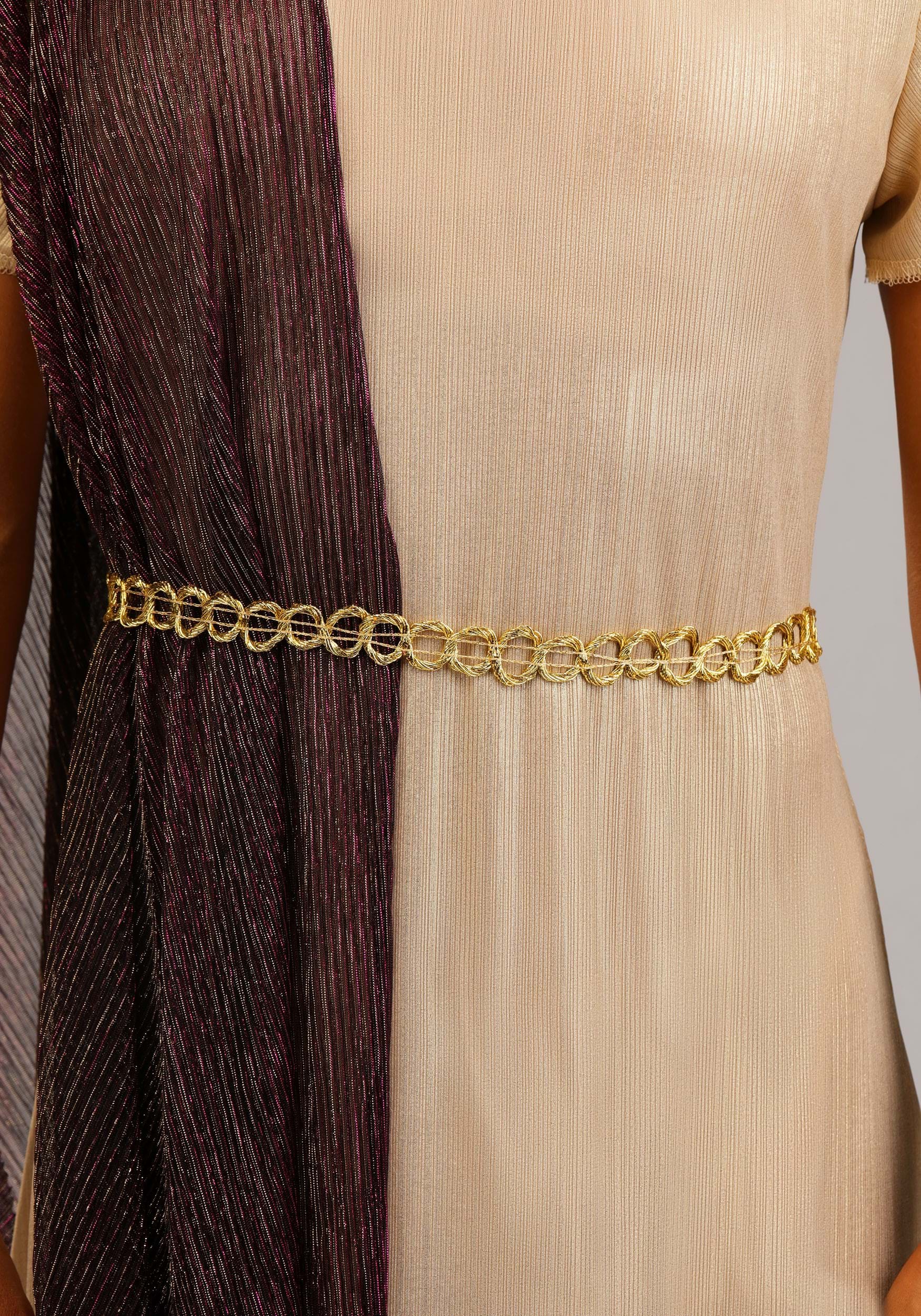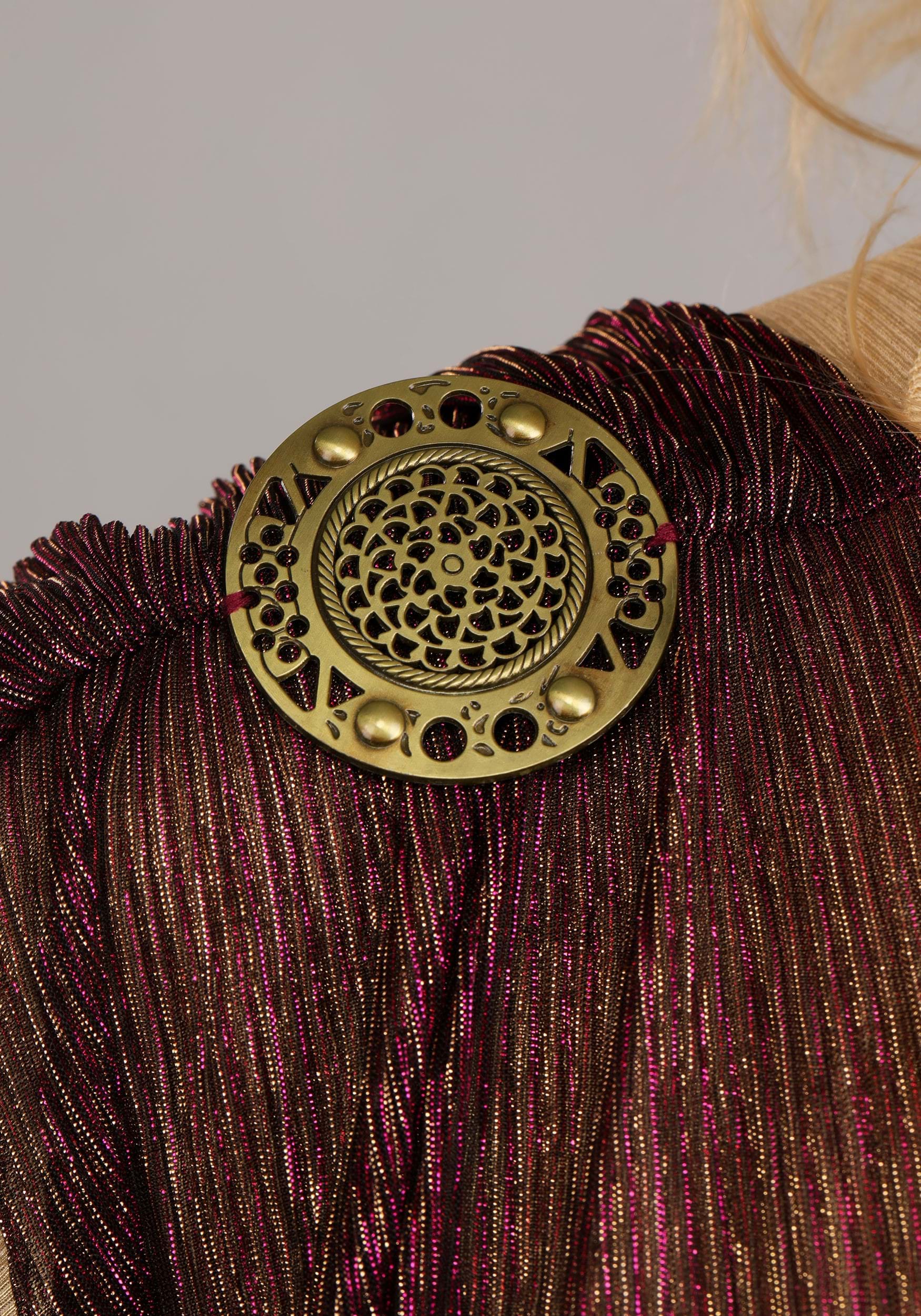 - Crinkle lame dress has an attached shimmer mesh cape, metal medallion on the shoulder
