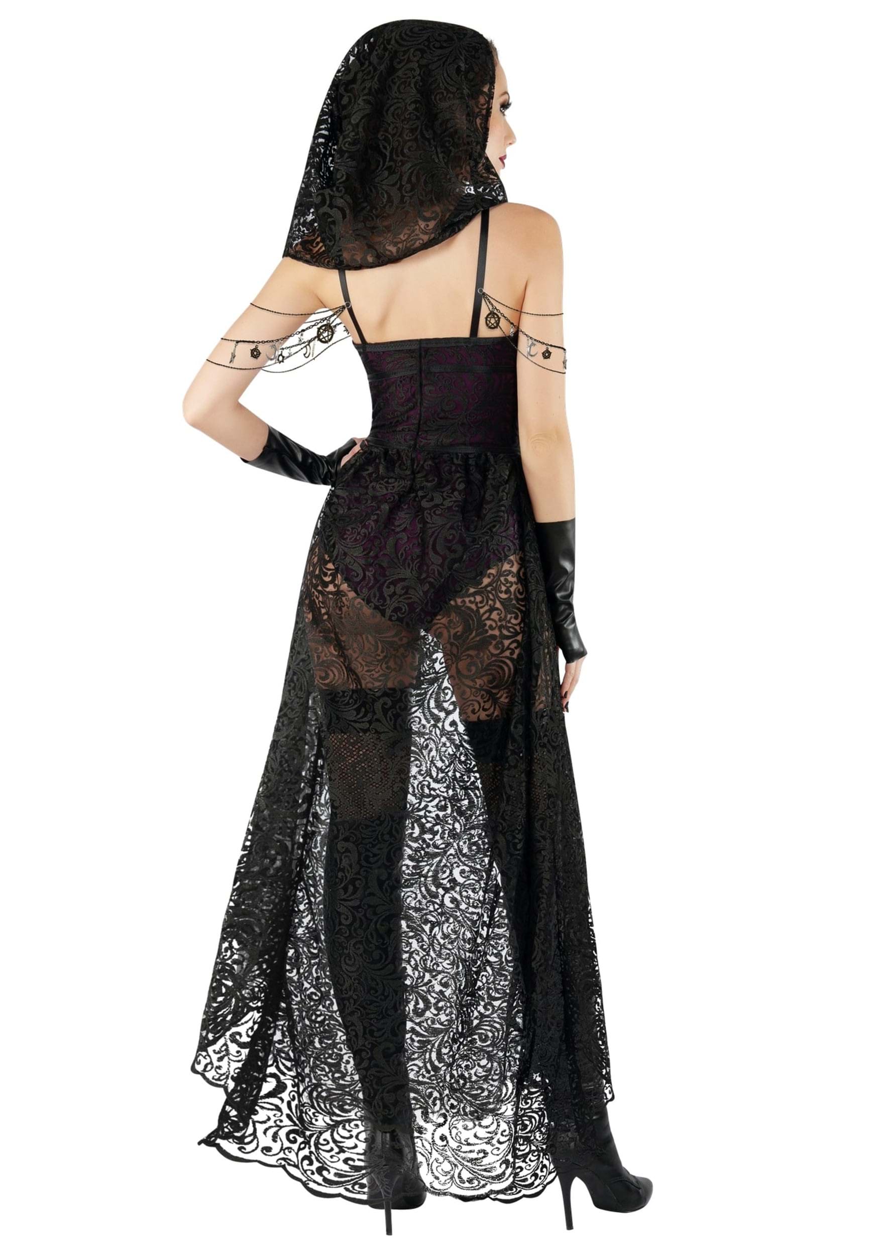 You'll feel like the keeper of ancient secrets in this dark priestess costume. The costume includes a deep purple bodysuit layered under a black lace gown. A harness is layered over top for an edgy feel. The skirt is split up the front for a sexy, flowing fit. Complete with a hood and cosmic charms draping across the chest and down the shoulders, you're sure to feel mysterious and powerful as soon as this costume arrives!