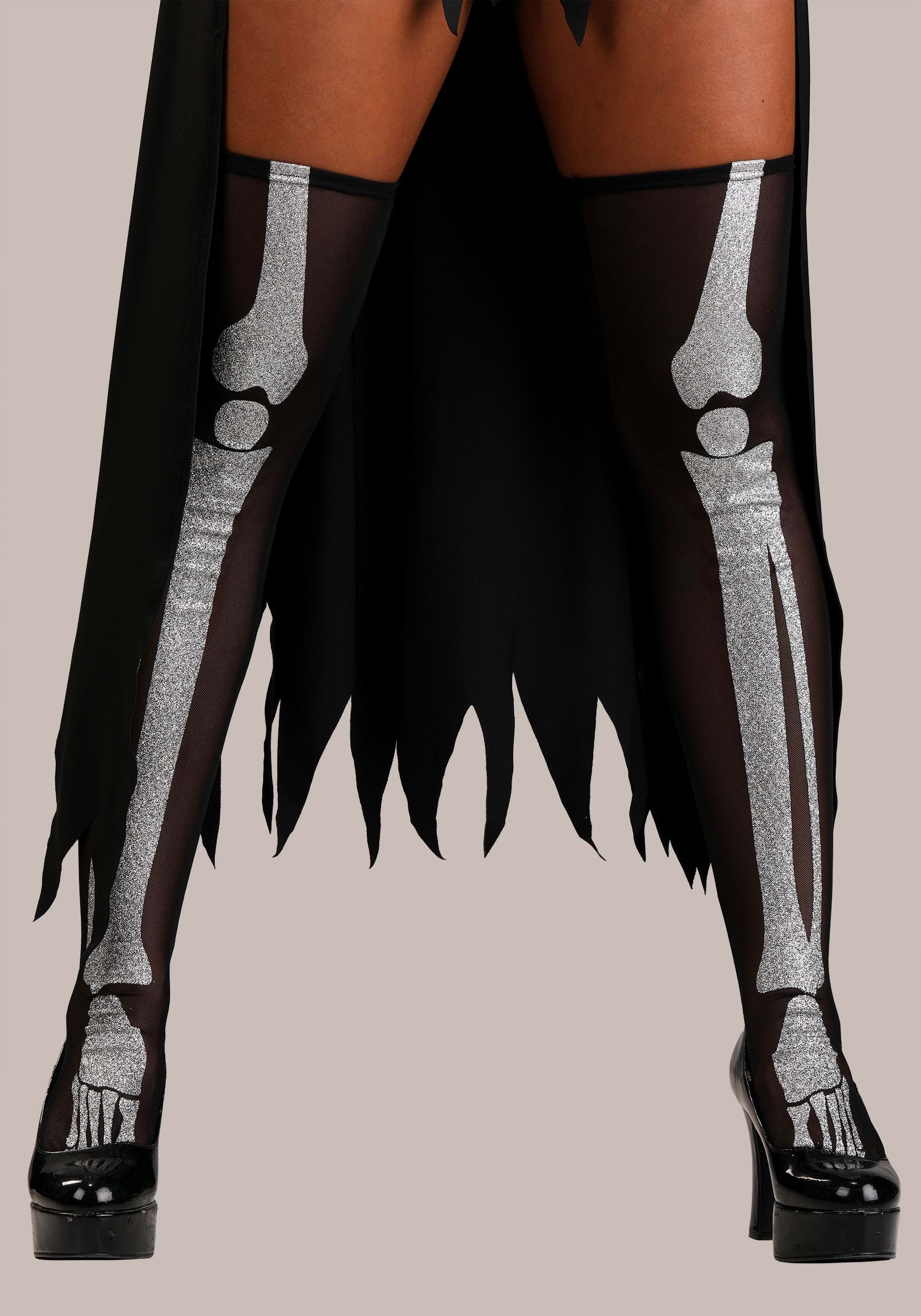 - Pair of mesh thigh high stockings have glitter printed skeletons on the font, fully enclosed feet