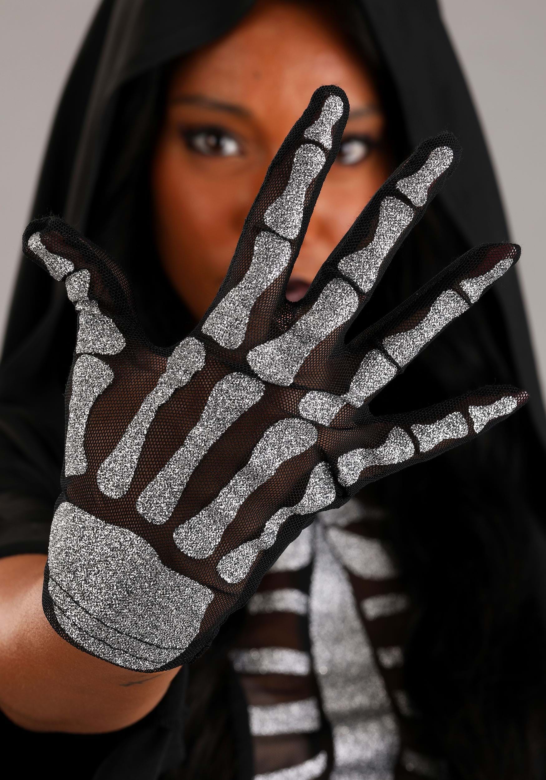 - Pair of mesh gloves have glitter printed skeleton graphics