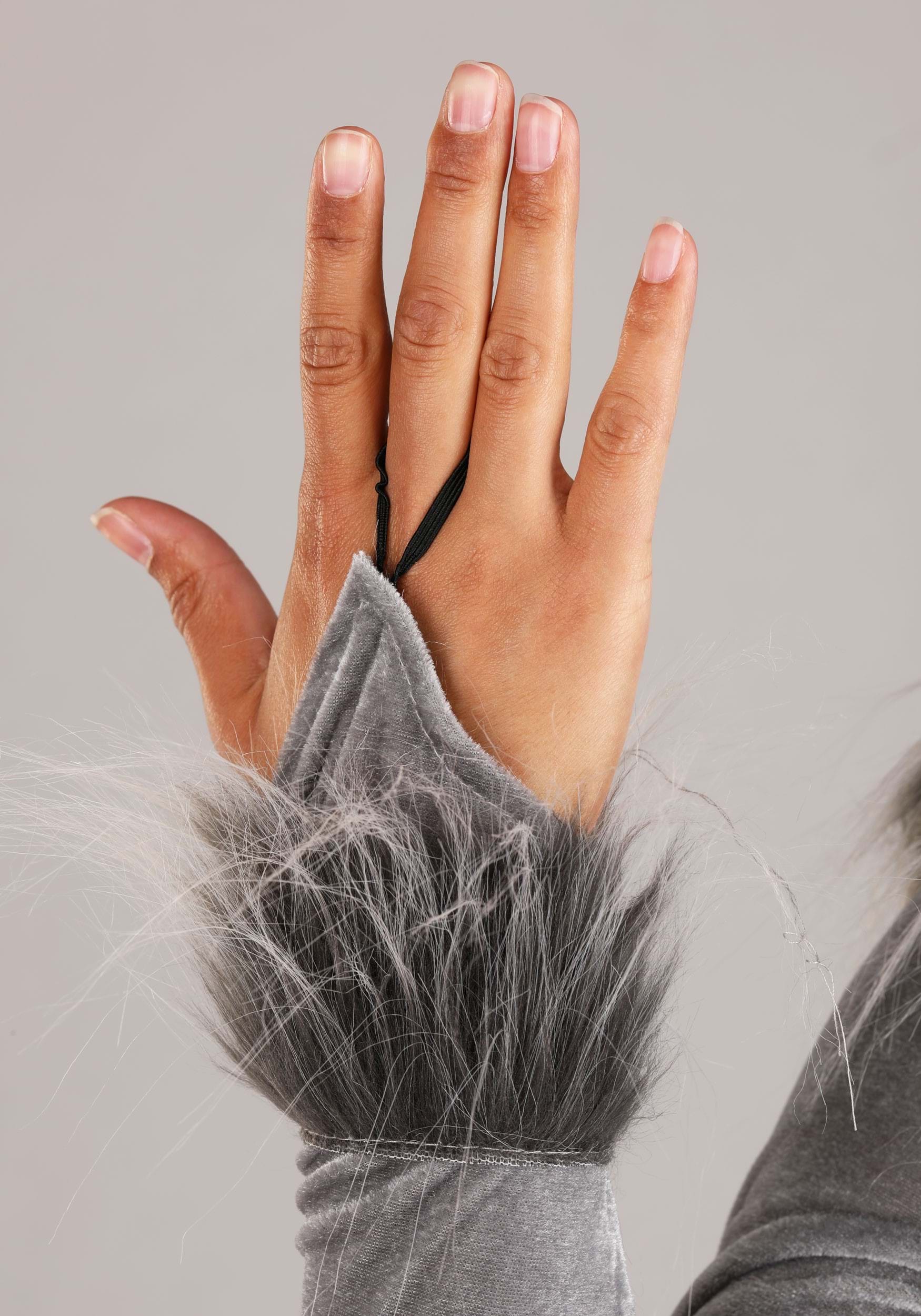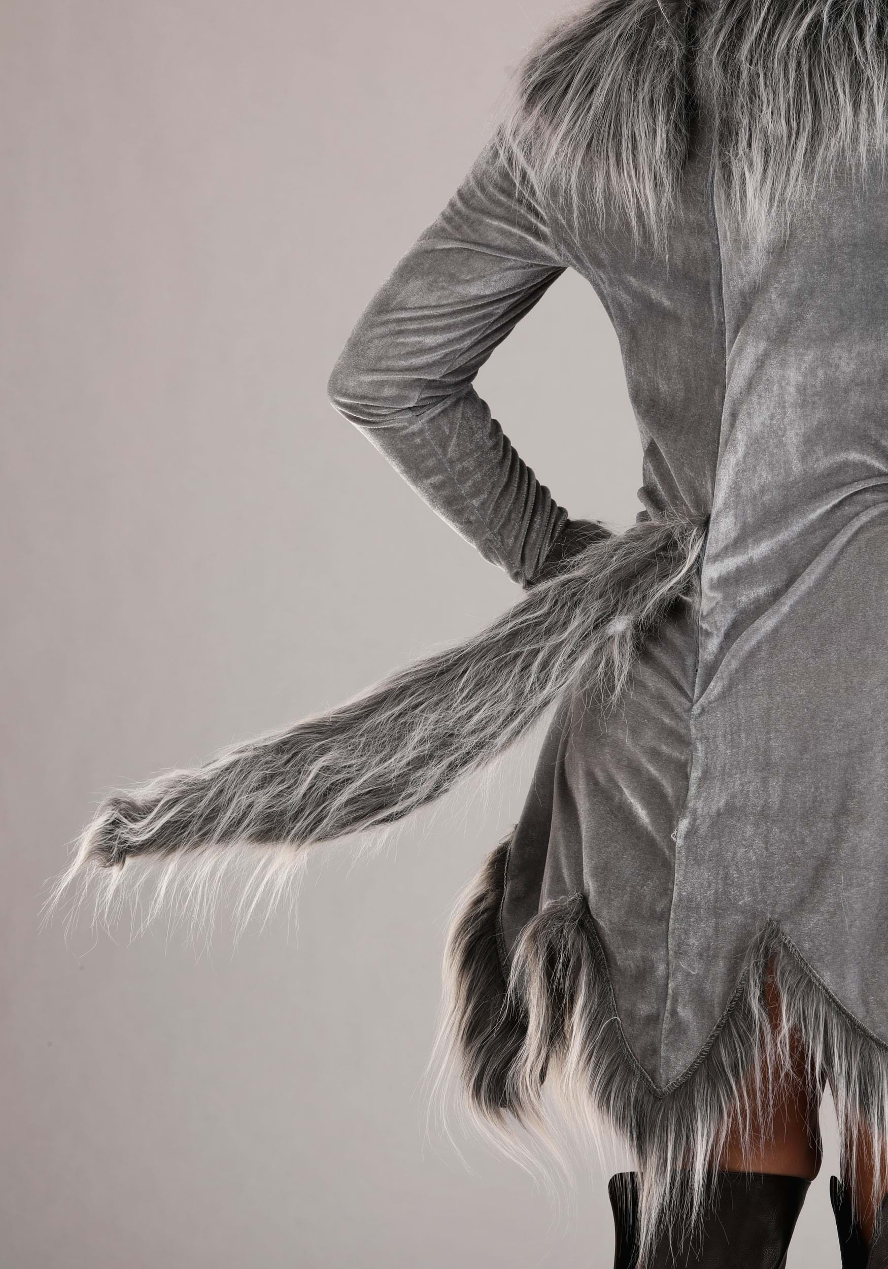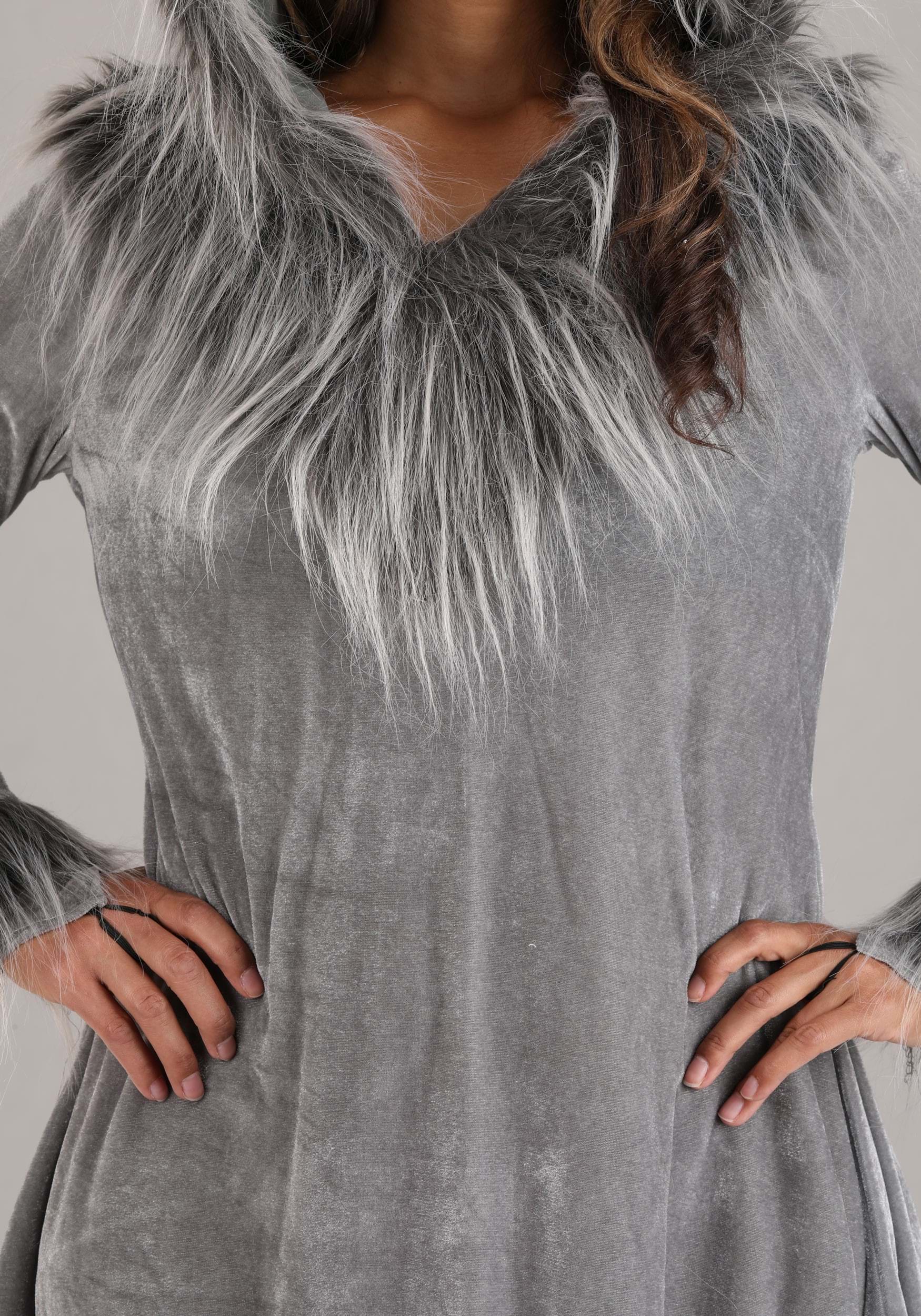 Want to let your wild side out for a night? This charming Made by Us costume is designed to make you feel right at home howling at the full moon. Our in-house designers combined a fur-trimmed ferocious look with fitted and flared elegance to create a woman's wolf costume that stands out from the pack. The soft dress zips up the back and features a long tail and a dramatic furry shoulder piece. Cut with our unique technic to make faux fur seem natural, the fur also lines the handkerchief hemline, the adorable animal hood, and the cuffs of the diamond-shaped sleeves.