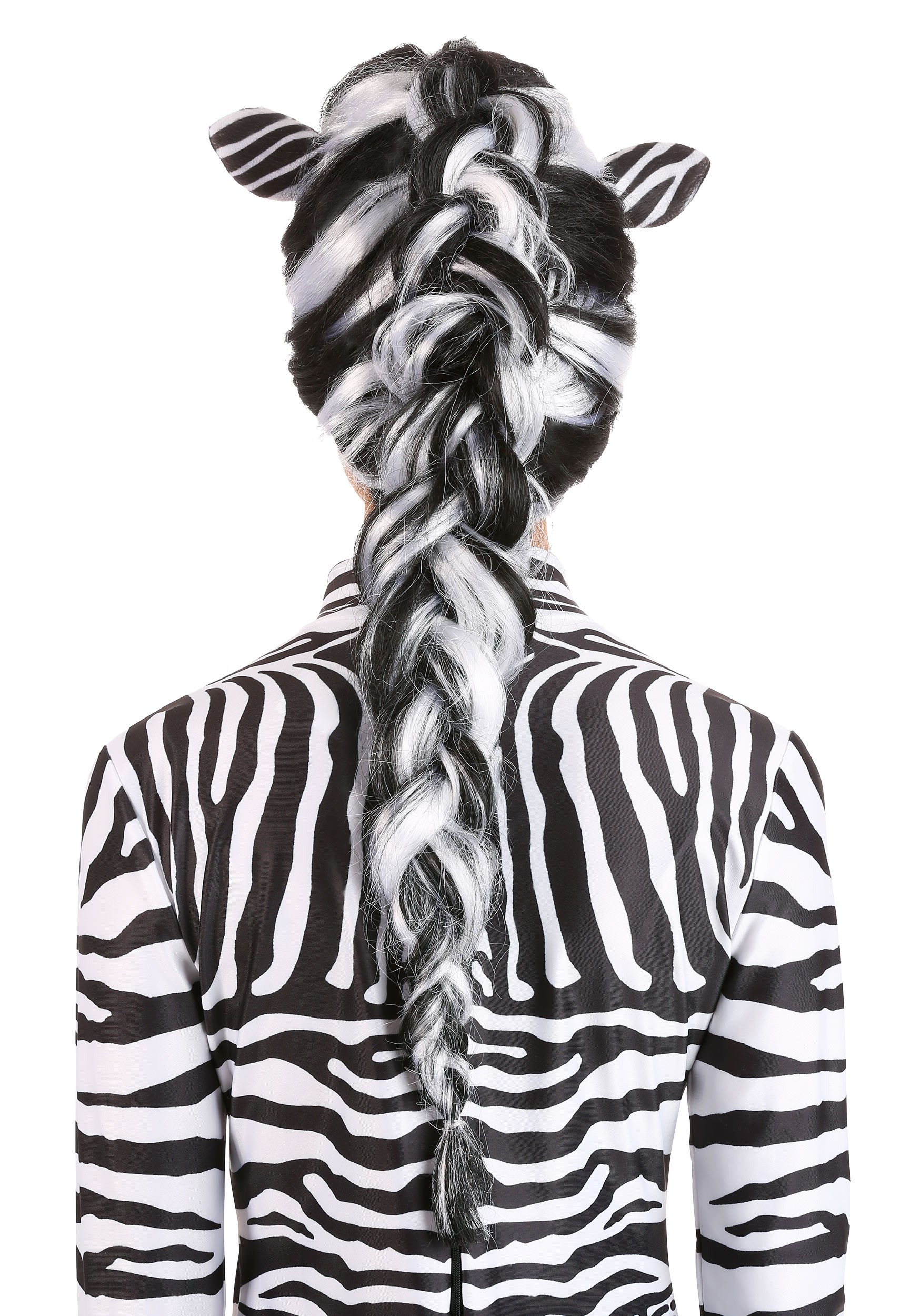 While our creative team has already designed zebra costumes for every age and in a range of styles, we still thought something was missing. Then we realized that we ought to be paying more attention to the zebra mane. Black and white twist together in this lovely braid that falls down past your shoulders. The top makes for a playful boeuf with the black and white ears peer from the side, letting everyone know that you are a zebra, not just some fashionista playing safari!