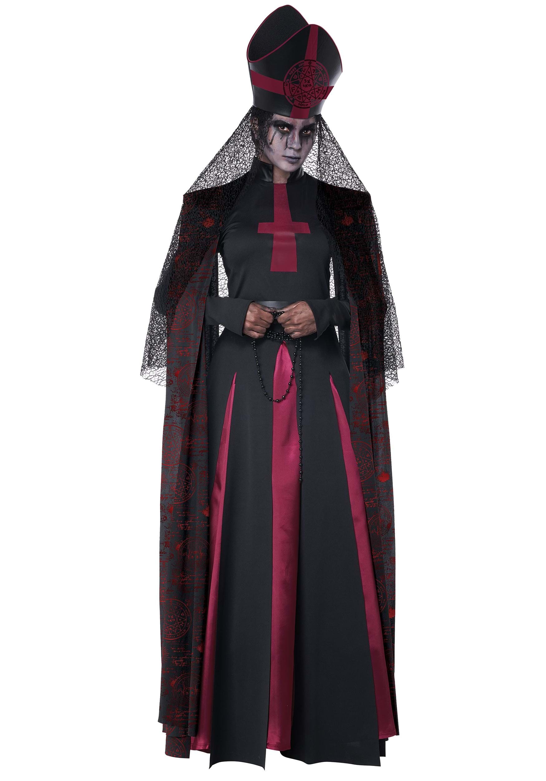 - Dress has double sleeves: fitted solid black inner sleeves, draped outer sleeves with occult symbols printed in dark red
